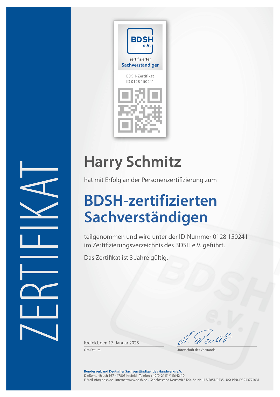 Als zertifizierter Sachverständiger können Sie auf meine anerkannte Fachkompetenz und höchste Standards vertrauen.